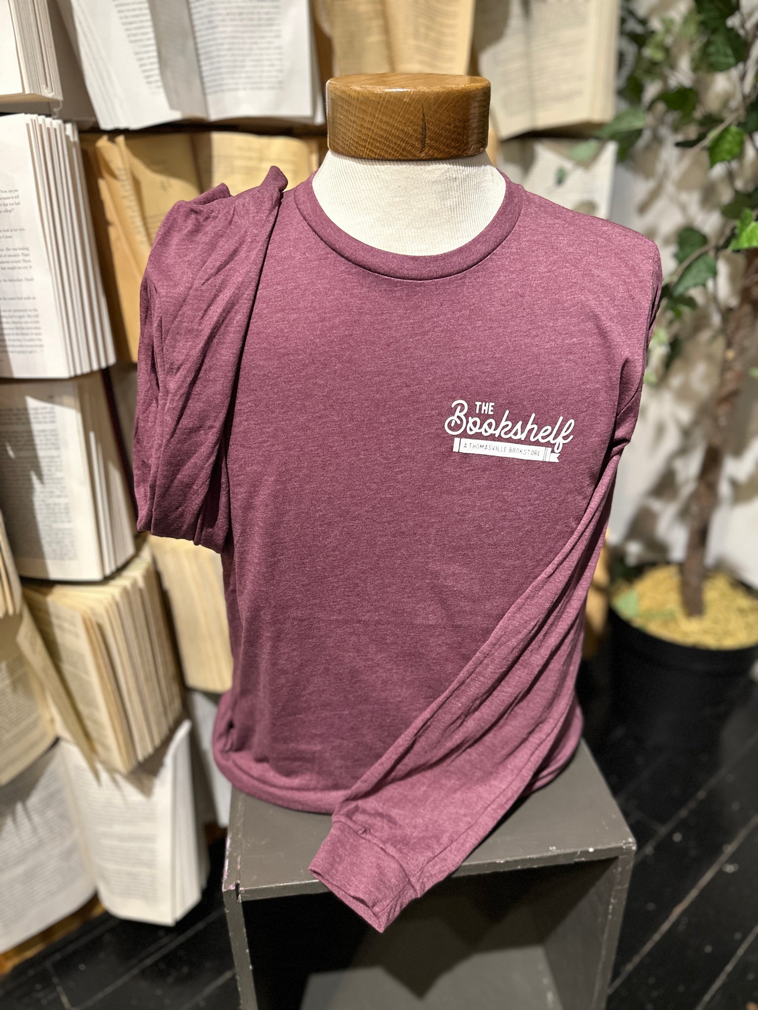 This beautiful and soft heathered garnet long sleeved tee shirt is perfect for layering on cold days and light enough to wear in transitional seasons. With the Bookshelf logo on the left upper chest, and a timeless quote on the back, you can "count on" this shirt to be your go-to apparel.