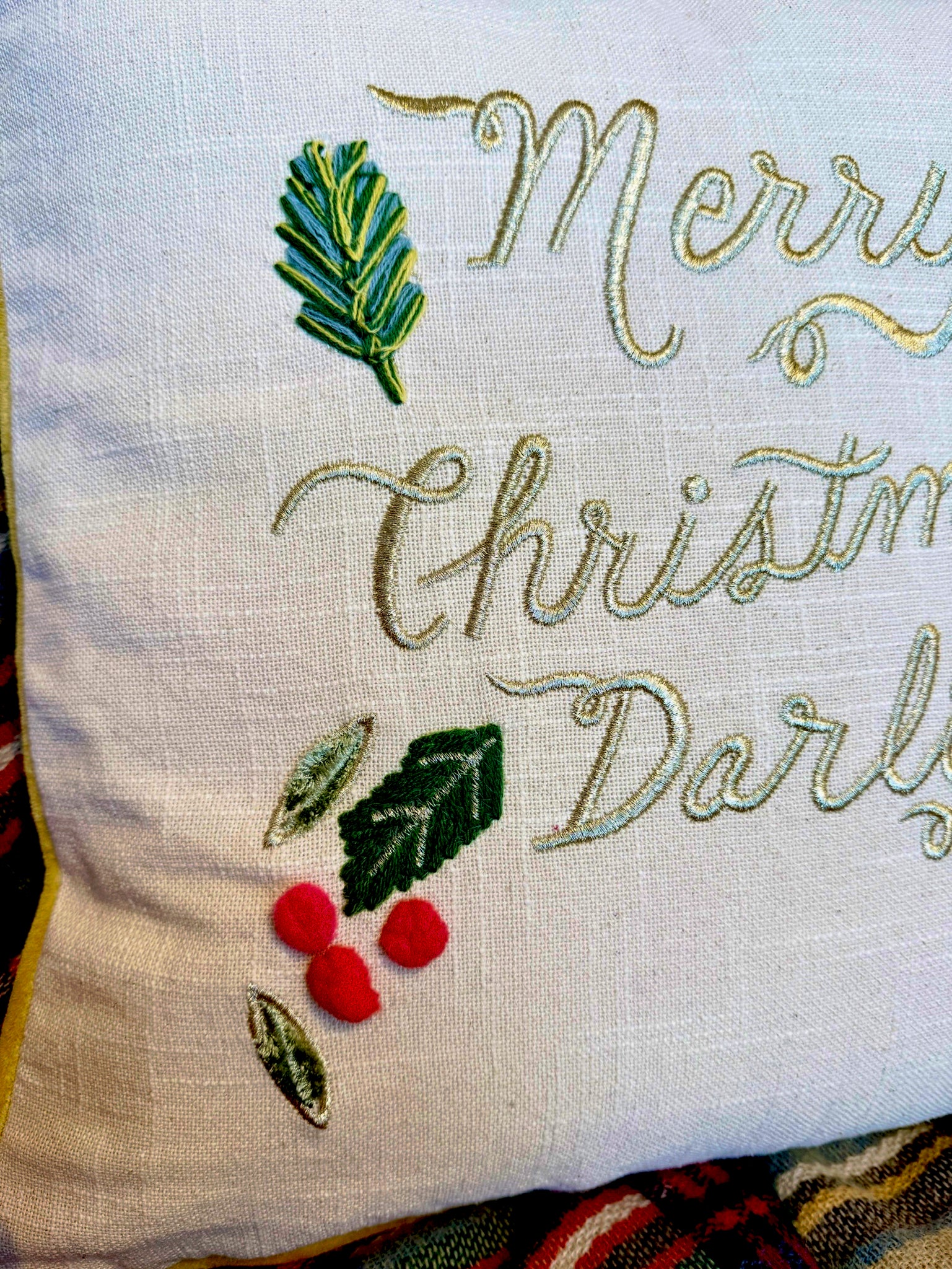 Celebrate the season with this delightful embroidered pillow featuring "Merry Christmas Darling" in beautiful gold stitching. The front displays charming holly berries while the back is covered in a gold velvet material. This includes a soft, supportive insert so it's ready to display right away. Whether nestled on your couch, bed, or gifted to someone special, this festive accent brings warmth and holiday spirit to any space.