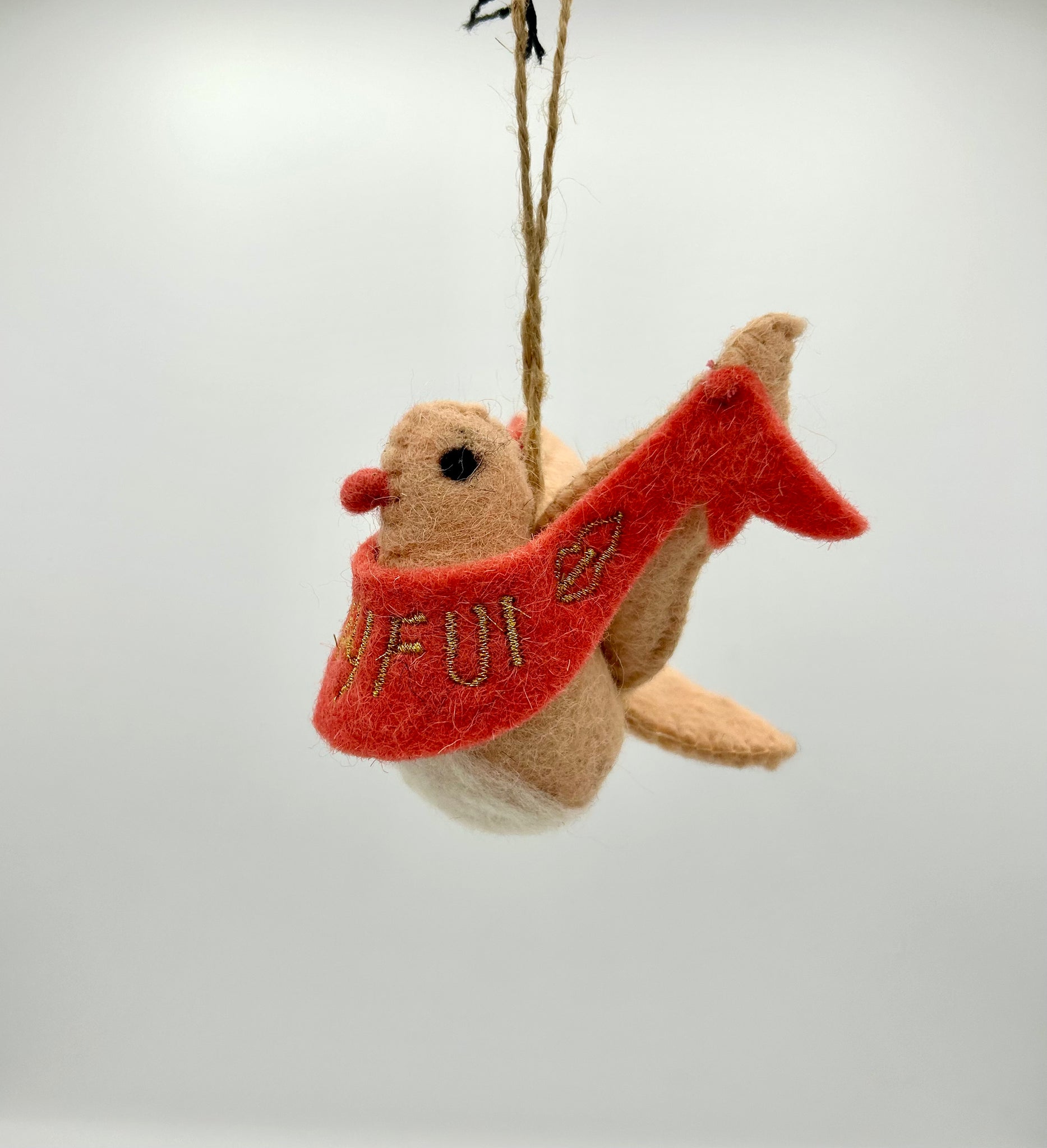 This delightful wool felt dove ornament is a treasure for your tree. Crafted in a lovely pink wool felt, the little bird carries a banner proclaiming "be joyful"—a uplifting message crafted with gold stitching. This is the perfect blend of festive spirit and meaningful sentiment, ideal for creating holiday memories or gifting to someone special.