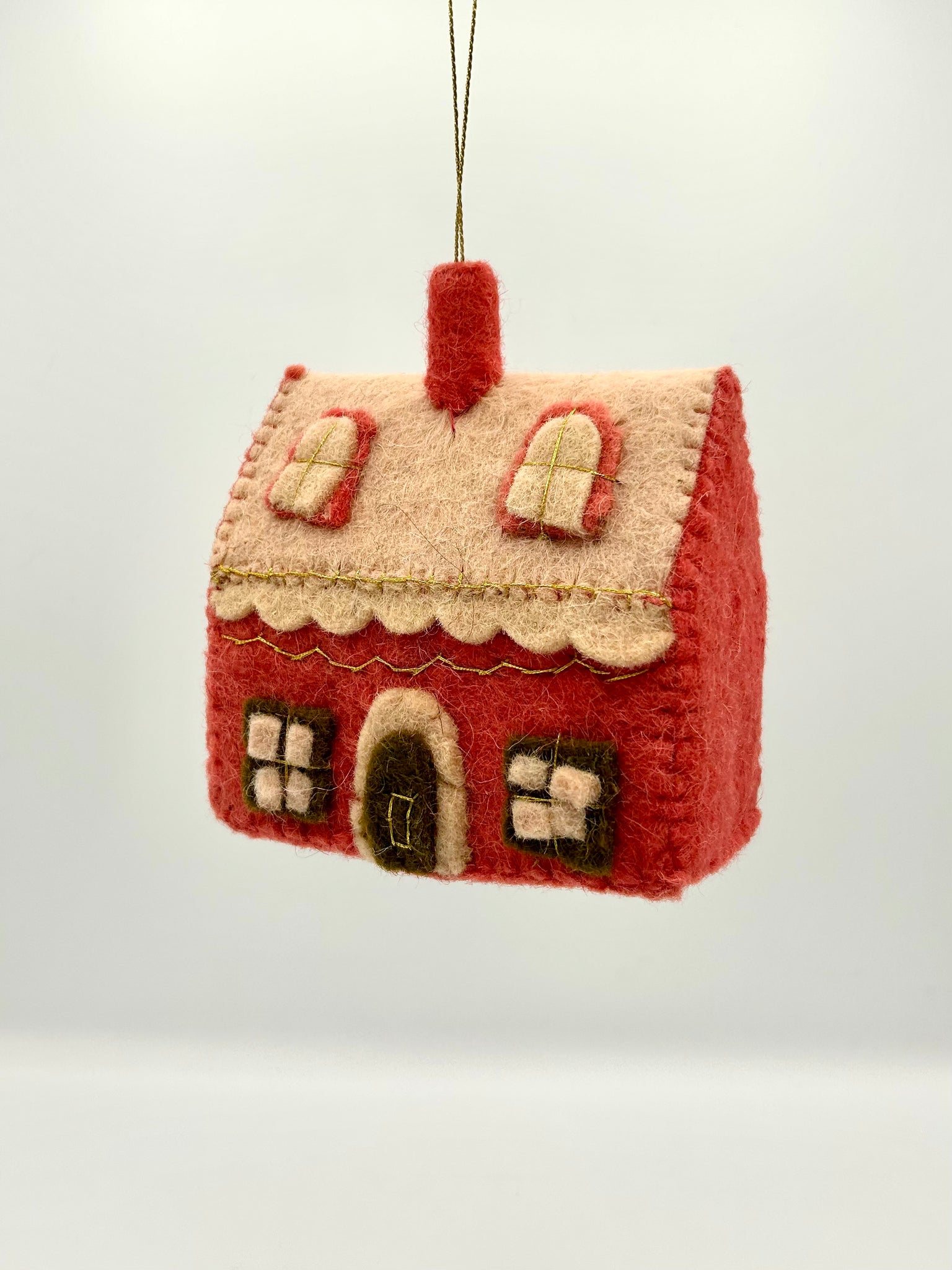 Brighten up your holiday decor with these charming handmade wool felt house ornaments. Each piece features soft pink wool felt accented with delicate gold stitching that catches the light beautifully. Choose between a tall silhouette or a wide design. Perfect for tree displays, gift wrapping, or creating a cozy seasonal vignette.
