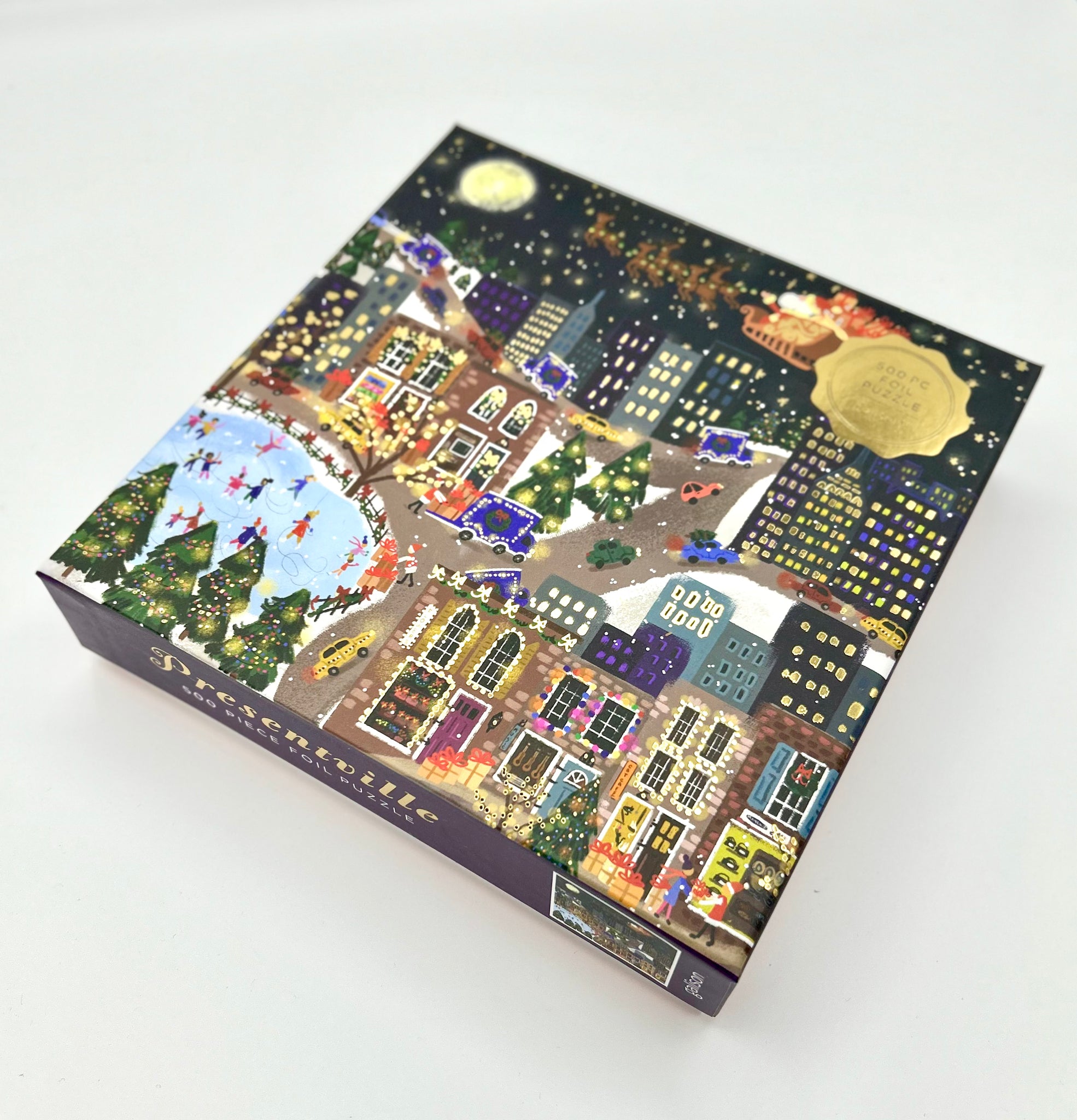Immerse yourself in Joy Laforme's festive Presentville 500 Piece Foil Puzzle, featuring a meticulously illustrated holiday-themed cityscape. The premium foil accents illuminate the seasonal urban scene, highlighting twinkling lights, snow-dusted buildings, and celebratory details with sophisticated reflective qualities. This expertly crafted puzzle offers a moderate challenge with precision-cut pieces that provide a satisfying assembly experience for dedicated puzzlers seeking both artistic merit and seasonal charm.